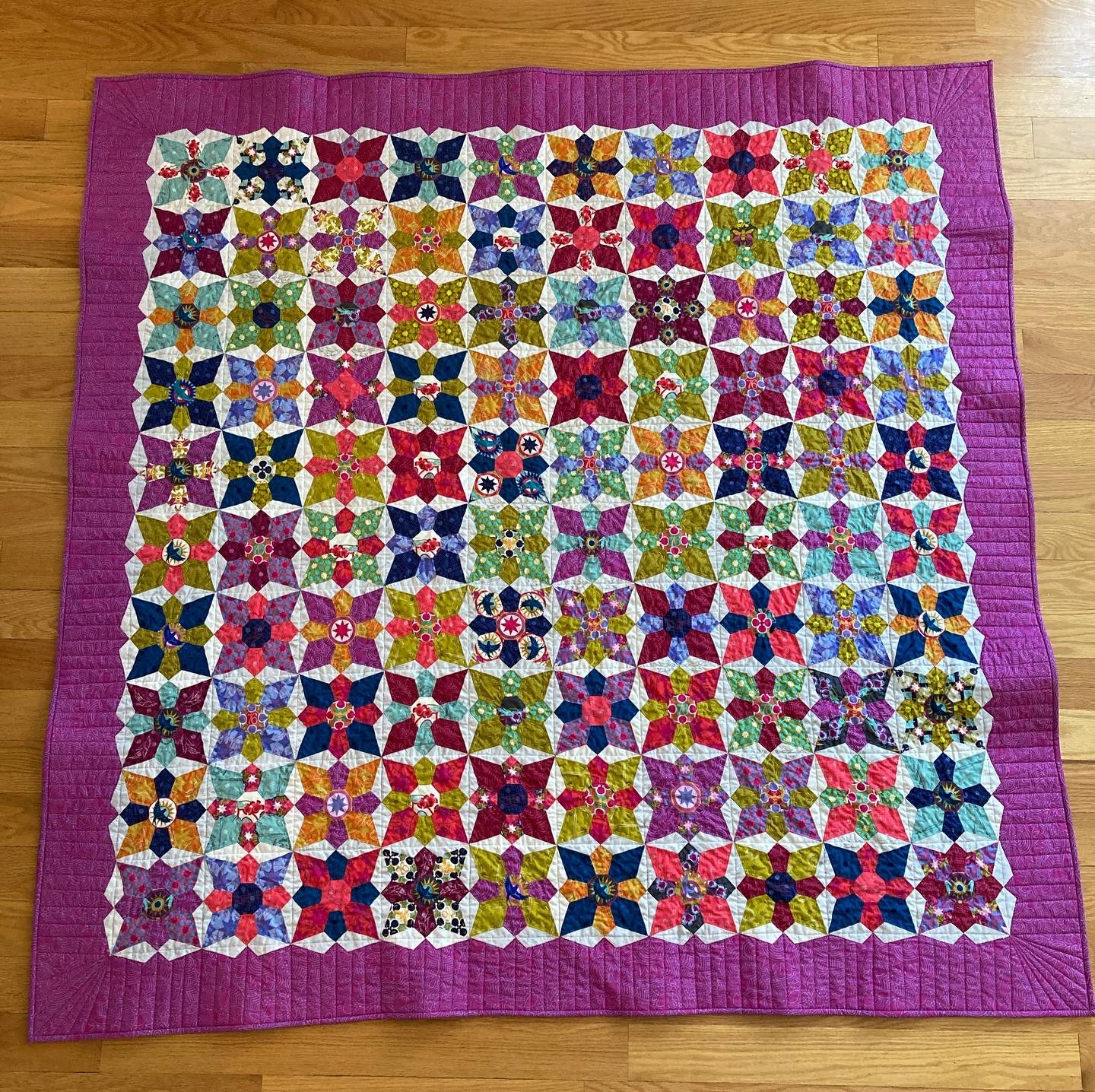 Here is the first English paper piecing pattern that made it to a quilt top. I stopped working on it when I decided I wanted to finish it by hand quilting. I’ve let this quilt sit in my guest room for THREE YEARS while I put off learning to hand quilt. One of the advantages of the COVID pandemic is I have a lot of time to sit in my house and supervise while my kids go to school. There were 100 blocks. I quilted the sections around the centers, which means I had 400 sections to hand quilt. This stunning pattern is from Karen at the DIYAddict.
