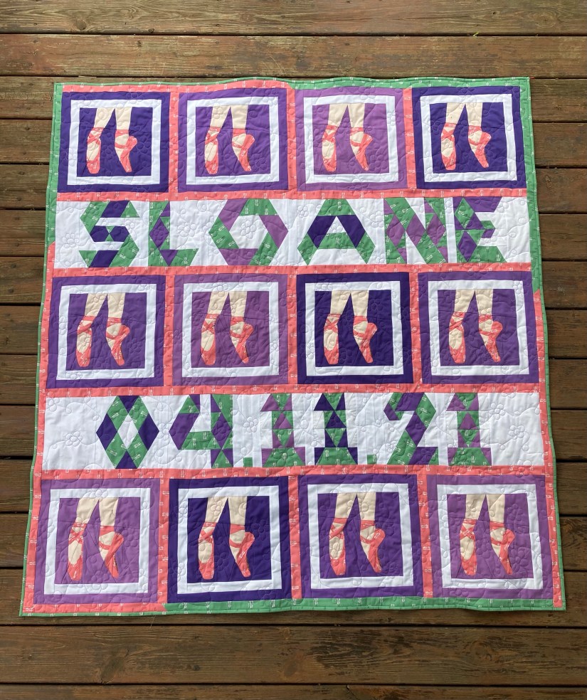 I adore making baby quilts. I think quilts are the perfect play mat for tummy time and it’s great that they can be thrown into the wash whenever the quilt falls victim typical baby behavior. When I found out my friend Robert’s wife was expecting I asked what the colors/theme of the baby’s room would be. He told me they were using pink and purple fabric and the theme was ballet and violins since he is a violinist and she love ballet. This how I interpreted the prompt. The ballet shows is from TartanKiwi and the letters is from JayBirdQuilts.