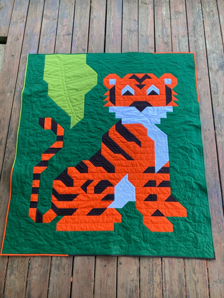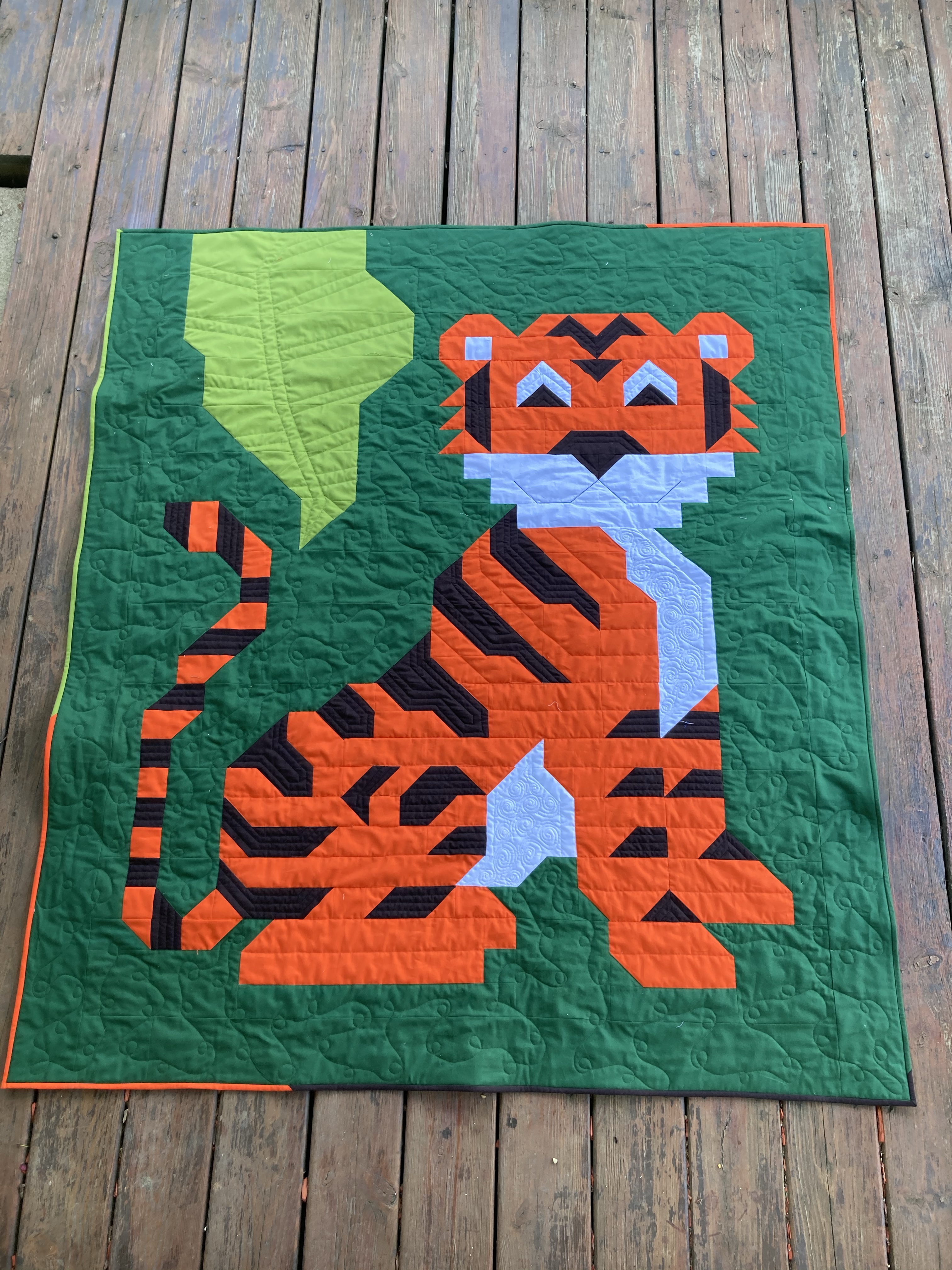 My five year-old gave me the puppy-dog eyes and asked for a quilt. What could I do? He asked for a tiger quilt. He picked the pattern and the fabric himself. The little tyrant REFUSED to let me pick any patterned fabric. The pattern is created by Counted Quilts.