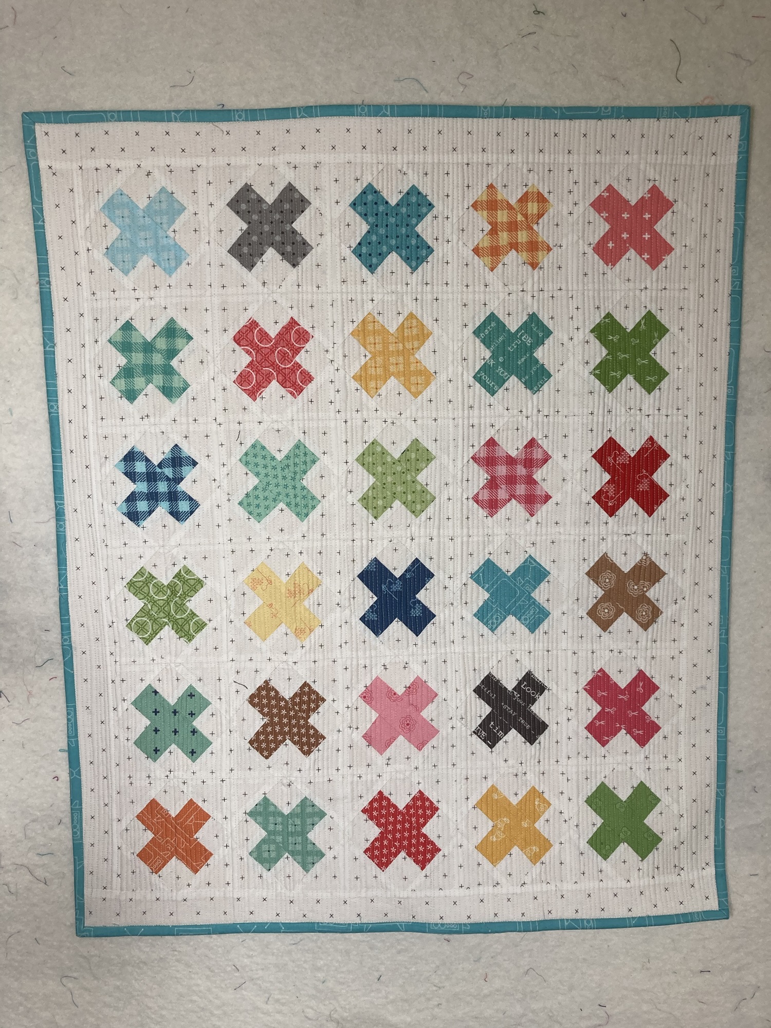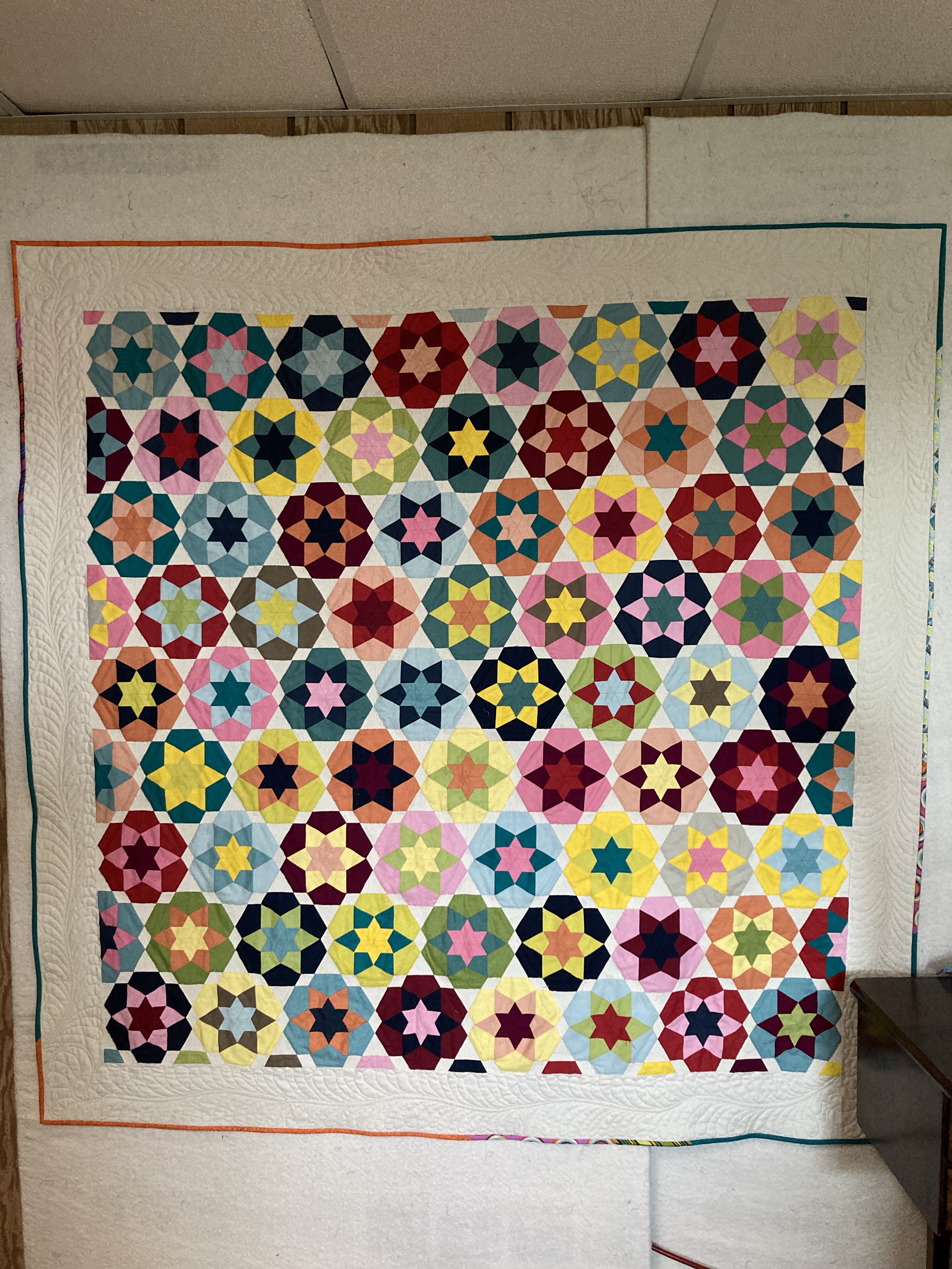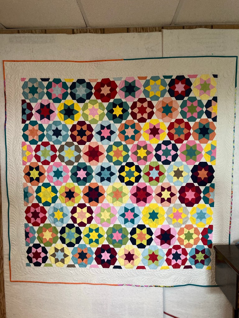 I made the star using English Paper Piecing and a 2.5 roll of rainbow Kona Cotton. I started in the center and sewed the diamonds in the color order they were arranged in. I was delighted with how the colors sorted themselves. I used the cast offs from my Exploding Heart Quilt quarter square triangles to serve as a border. I’m extremely please with how the quilting came out on this quilt. I’m planning to use it as my June background for Zoom. (Also, I swear there is binding on it IRL, but it was too much of a pain to try to photograph again.)