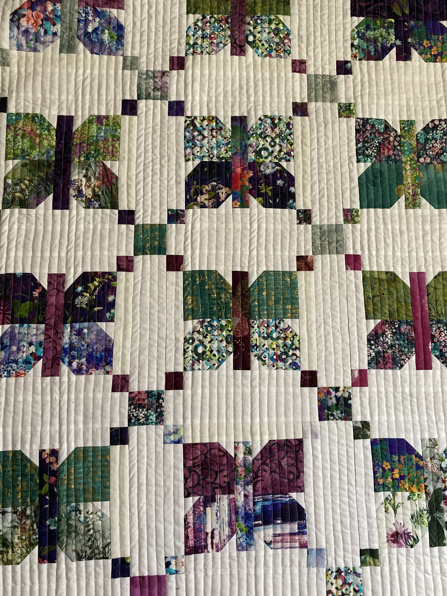 In 2023 I committed to not buying new fabric and using what I already had. This quilt was made from a 10in square pack I’d had for years and various shades of white that were from a 2.5in roll and scrapes that I had. The backing is scrappy mix of leftovers from other quilt backing. I thought limiting myself to what I had would sap my creativity, but it turns out the limits pushed me to try new things.