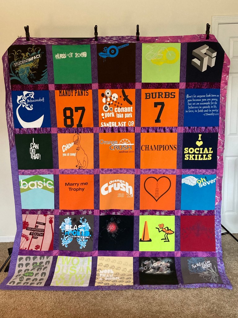I spent 6 years volunteering with teenagers, and the organization was really big on t-shirts for camps and for all sorts of events. I didn’t want to wear the shirts anymore, so I opted to put them into a quilt. I prepped the blocks ages ago, but then they just sat. Mostly because I really hate making t-shirt quilts. This quilt got caught up in my plan to clear out my quilting space in 2023. I have an old piece of canvas that was used to make a Schaconahoff flag for a Sandblast at one time, and I’m going to try to make that into the backing. We’ll see how it goes.